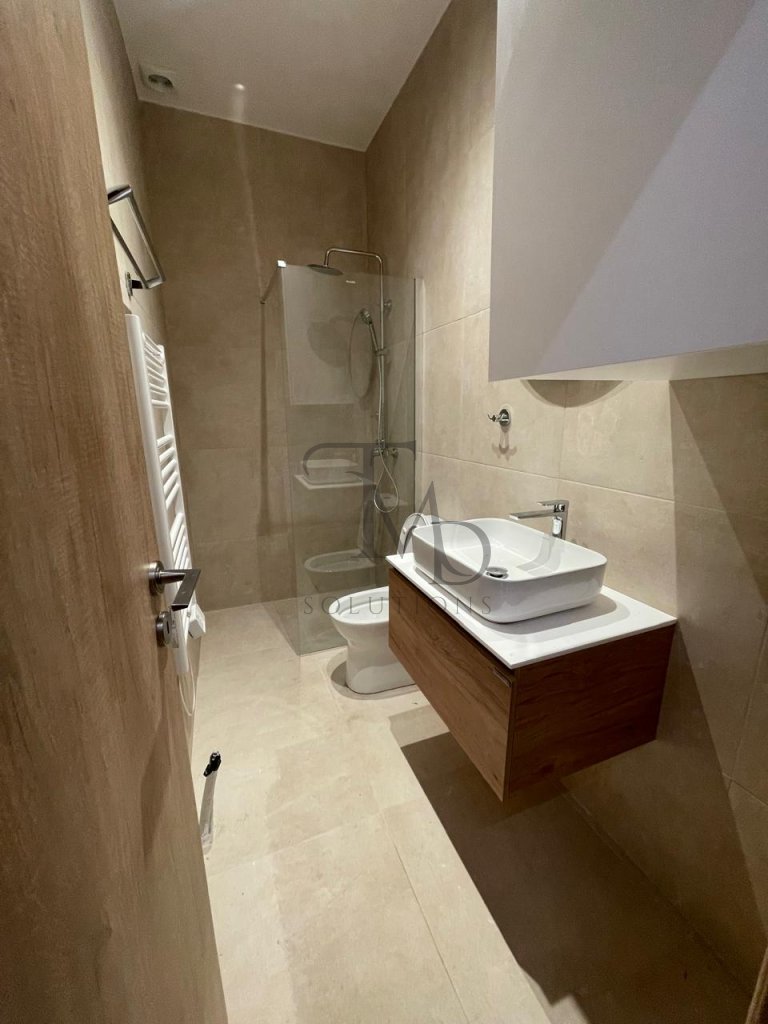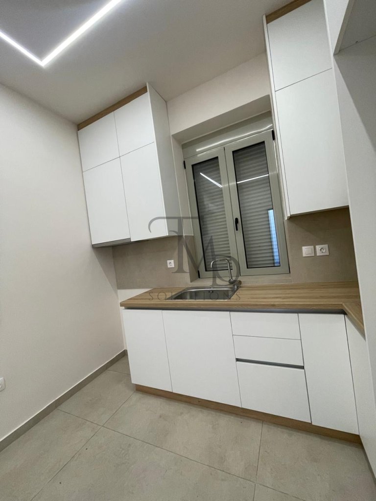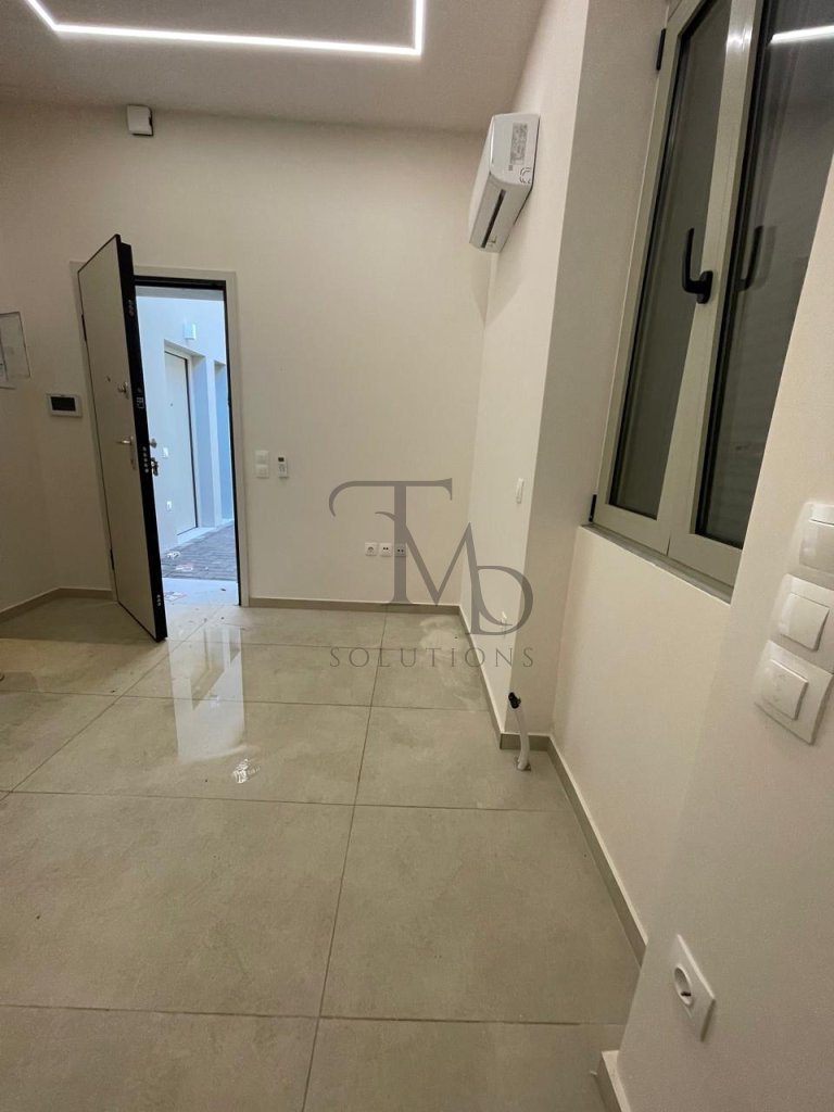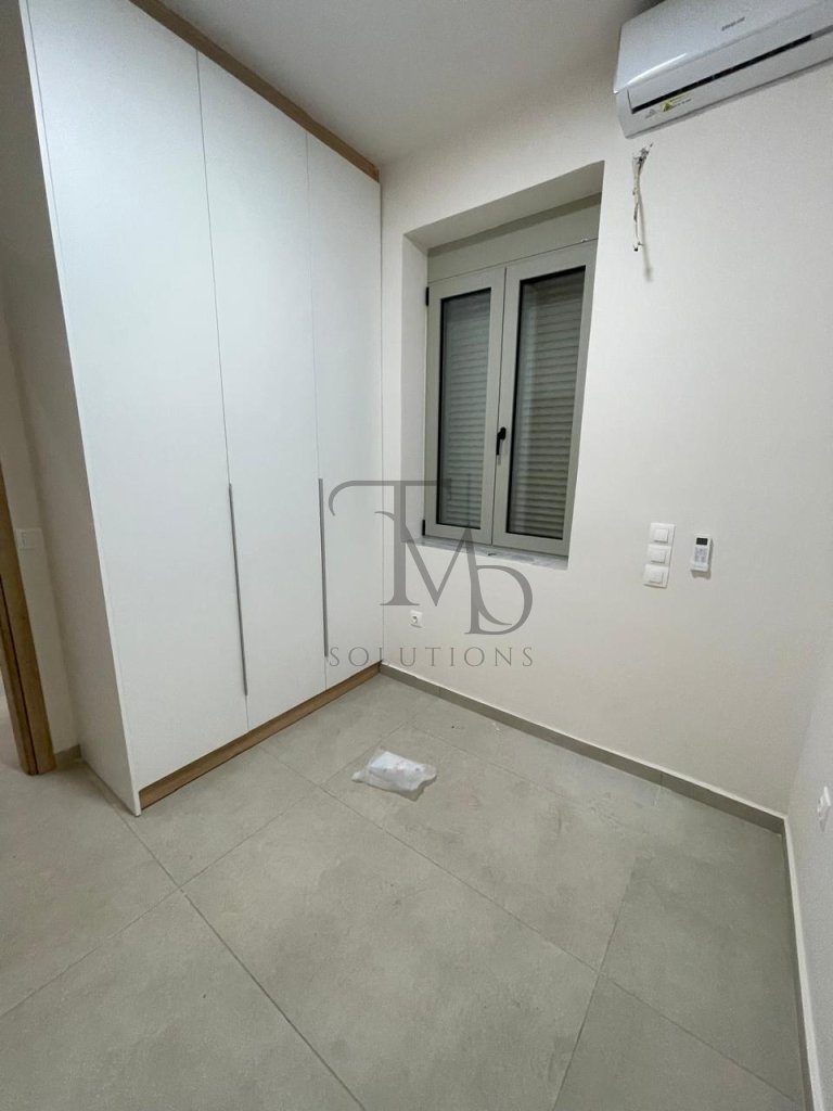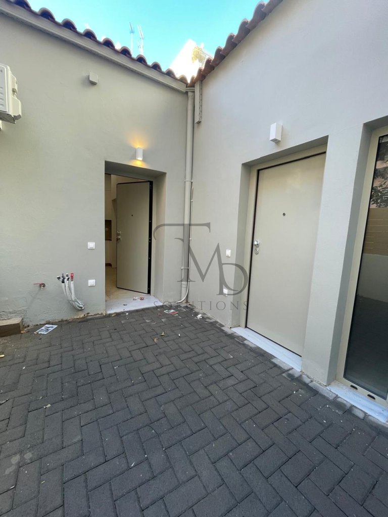 A beautiful ground-floor apartment is available for rent, fully renovated in 2025. It features 1 bedroom, an open-plan living room with kitchen, air-conditioning units, aluminium frames, a security door, and modern amenities. The apartment has a shared courtyard with another apartment, offering a pleasant outdoor space for relaxation.